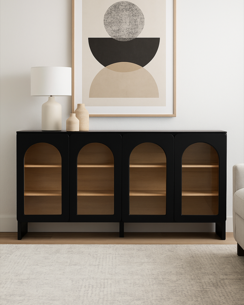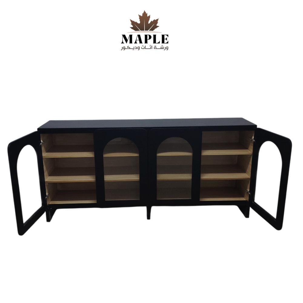 طاولة بوفيه خشب هي الاختيار المثالي لمن يبحث عن التوازن بين الجمال والعملية. الطاولة مصنوعة من خشب MDF تايلندي بسطح متين وأنيق. أبواب مقوسة فتح ضغط مع مفصلات إيطالي هيدروليك تمنحك سهولة في الاستخدام. الطاولة تحتوي على ثلاث خزنات من الداخل توفر لك المساحة اللازمة لتخزين الأدوات أو الطعام. اللون الأسود الأنيق من الخارج يتناغم مع الخشب الفاتح من الداخل، مما يضفي مظهرًا دافئًا وأنيقًا.