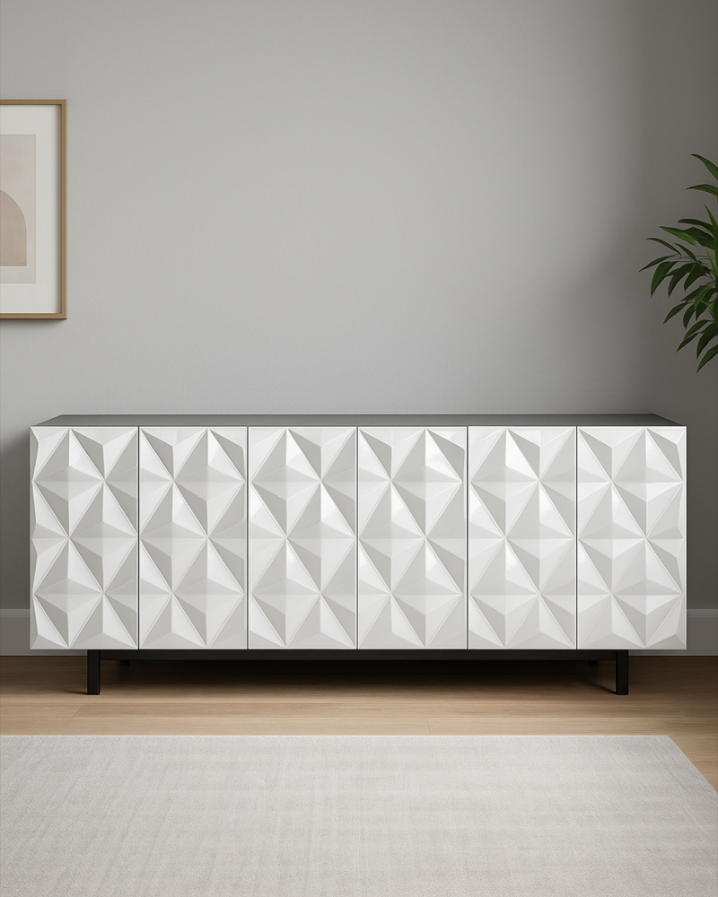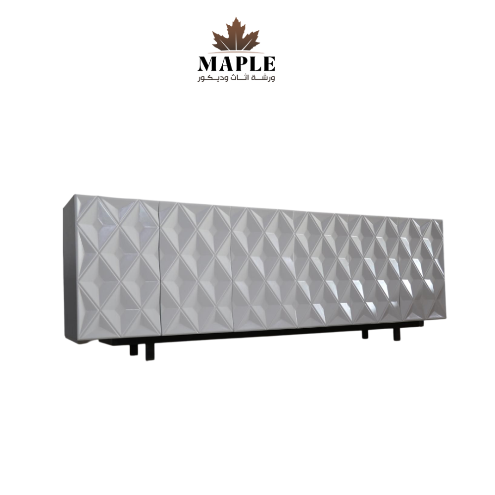 - بوفيه مودرن أبيض مع تصميم عصري يجعل من الغرفة أكثر اتساعًا وجمالًا.