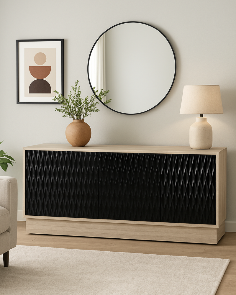 دولاب بوفيه مودرن هو القطعة المثالية لتكمل ديكور منزلك أو مكتبك. مع أبواب فتح ضغط تتش وتقنية أثري دي، يضمن لك هذا البوفيه تجربة استخدام سهلة ومريحة. تصميم الخزنتين من الداخل يسمح لك بتخزين الأغراض بطريقة مرتبة وفعالة، بينما يضيف السطح الخشبي الفاتح لمسة من الدفء إلى المكان. الألوان الجميلة والجمالية المميزة في هذا البوفيه تجعل منه قطعة فنية عملية في الوقت نفسه.