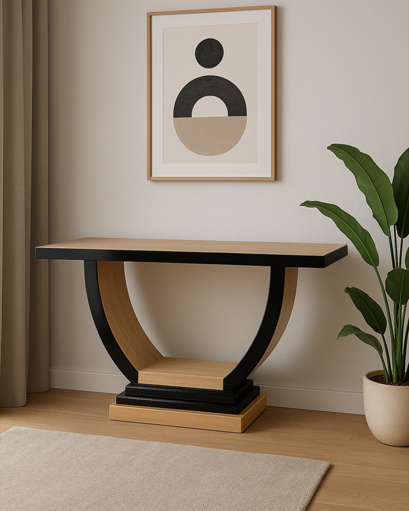 - كونسول خشب أسود وبيج يعطي تباينًا جذابًا بين الألوان ويضفي مظهرًا أنيقًا على أي مساحة.